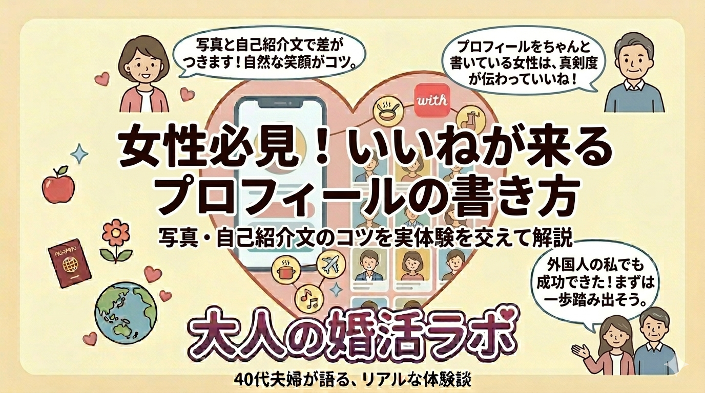 プロフィールは、相手に「この人に会ってみたい」と思ってもらうための自己紹介状です。条件の羅列より、一緒にいるイメージが湧く言葉を意識して書くことが大切です。