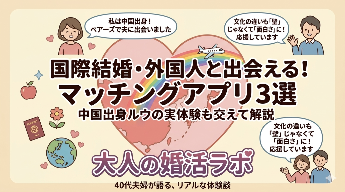 「日本に住む外国人と出会いたい」「海外の方と国際結婚したい」という方が増えています。実は、日本のマッチングアプリの中にも外国人ユーザーが多く登録しているサービスがあります。 ポイントは「国際対応しているアプリを選ぶ」こと。外国語インターフェースがあり、外国人ユーザーが自然に集まっているアプリを選ぶことで、国際恋愛・国際結婚への距離がぐっと縮まります。