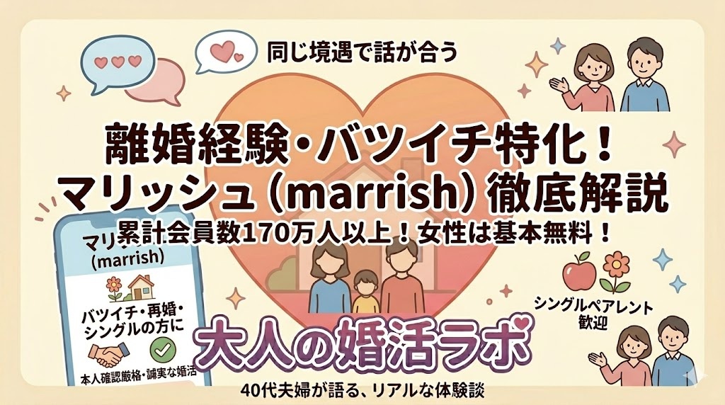 マリッシュは、再婚・バツイチ専門のマッチングアプリとして非常に完成度が高いサービスです。 同じ境遇の相手と出会えること、子どもがいることを肯定的に受け止めてもらえる環境は、他のアプリにはない大きな強みです。料金もリーズナブルで、女性は無料で始められます。 ただし、一般的なアプリよりユーザー数は少ないため、地方在住の方や幅広い選択肢が欲しい方は、ペアーズやyoubrideなどと並行して利用するのがおすすめです。