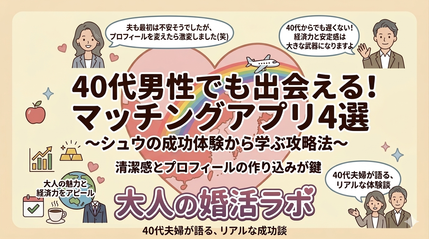この記事では、40代男性がマッチングアプリで成功するためのポイントと、婚活・恋活の目的別におすすめアプリを紹介します。