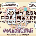 国内最大の会員数2,000万人を誇るペアーズは、40代男性の婚活においても最優先で登録すべきアプリです。「40代婚活」「年上好き」などのコミュニティに参加することで、年齢をポジティブに活かしたアプローチができます。
